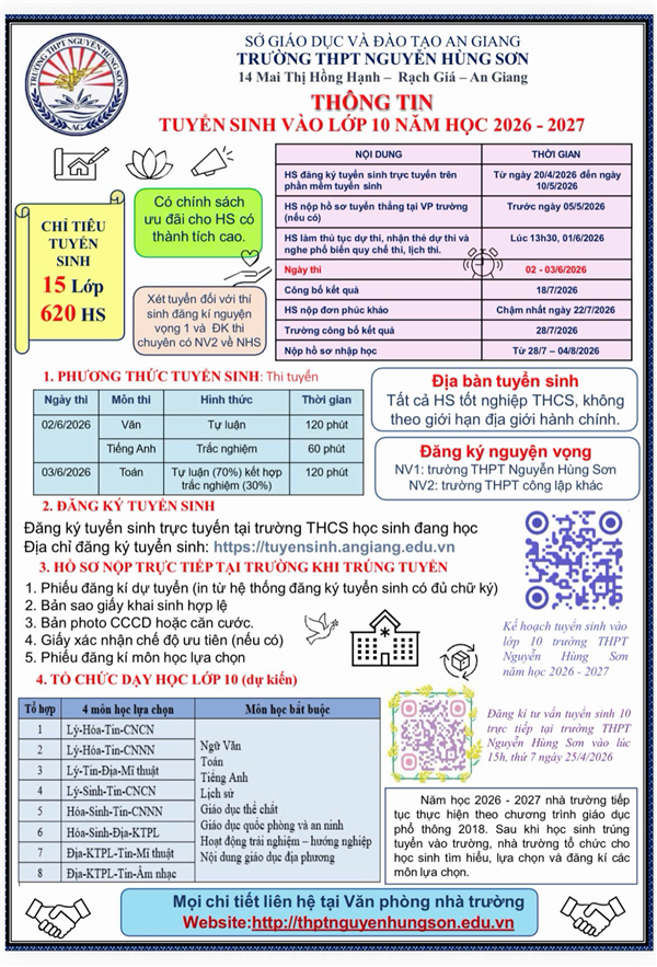KẾ HOẠCH TUYỂN SINH VÀO LỚP 10 TRƯỜNG THPT NGUYỄN HÙNG SƠN, NĂM HỌC 2026 - 2027.